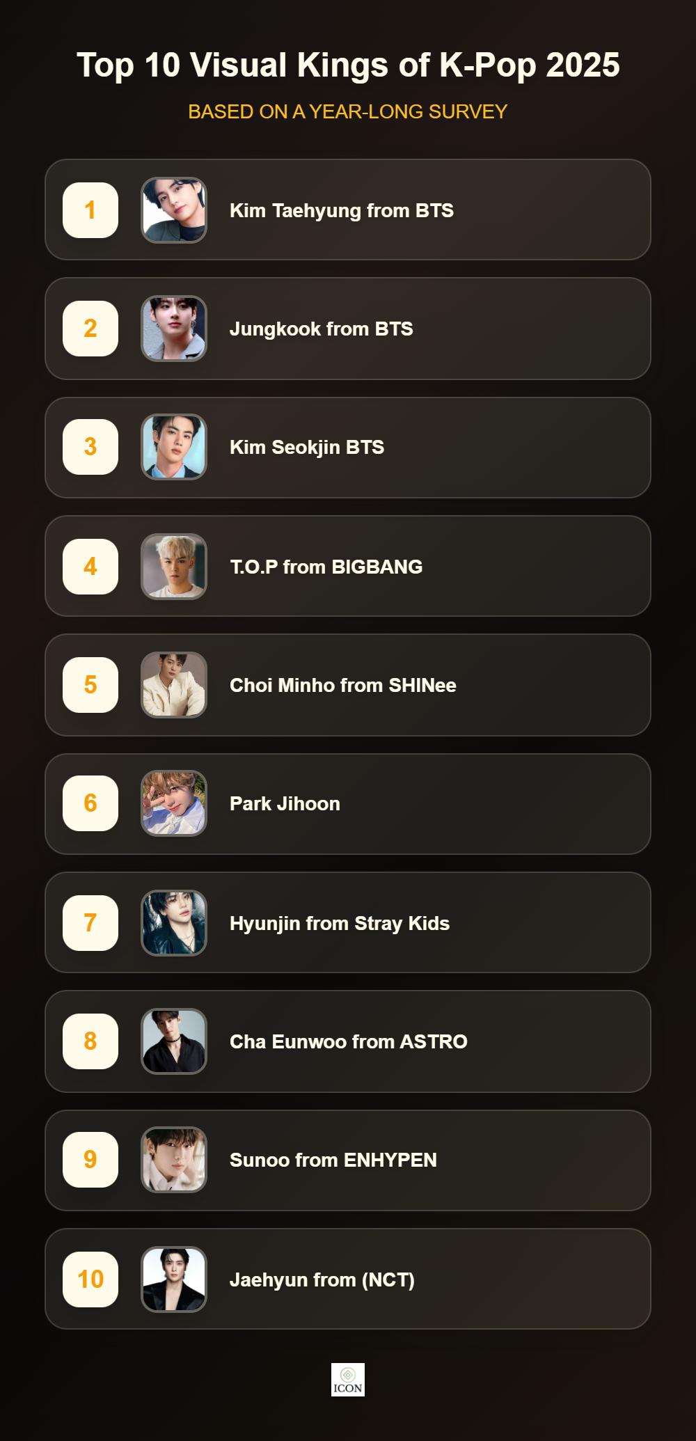 We at ICON are beyond excited to finally share the official results of our Best Visual King of K-Pop poll! This has been one of our most anticipated surveys and wow the participation from K-Pop fans around the world has been absolutely incredible. We've watched all of you passionately support your favorites throughout this entire voting period and it's been such an amazing experience.